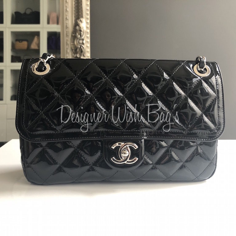 Chanel Medium Flap Bag Black Patent Leather with silver hardware.