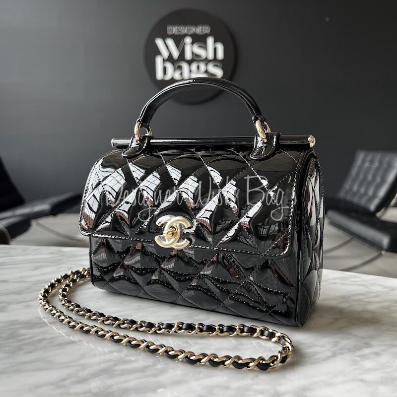 Crafted in stunning black patent leather with champagne gold hardware.